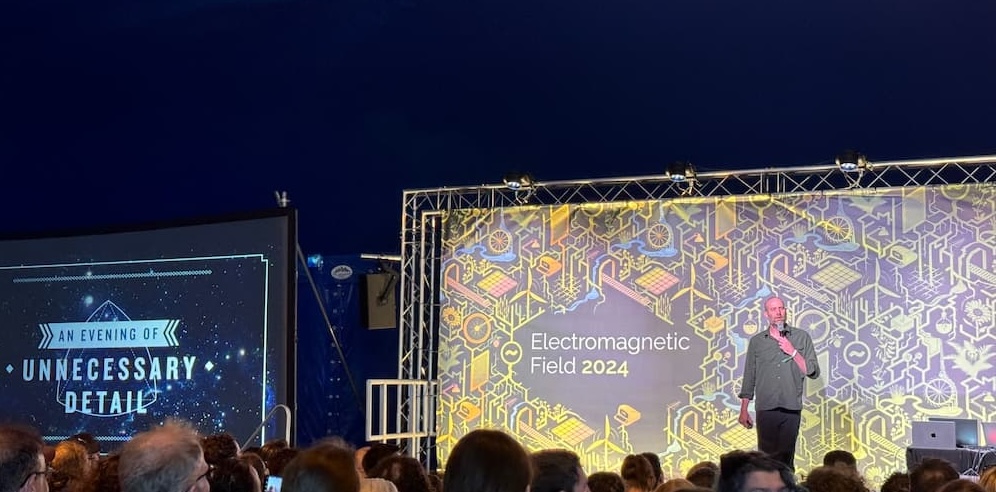 ![A photo of a stage with a crowd of people at the bottom. A screen to the left is showing the title image for an evening of unnecessary detail](../images/emf-evening-unnecessary.jpg)